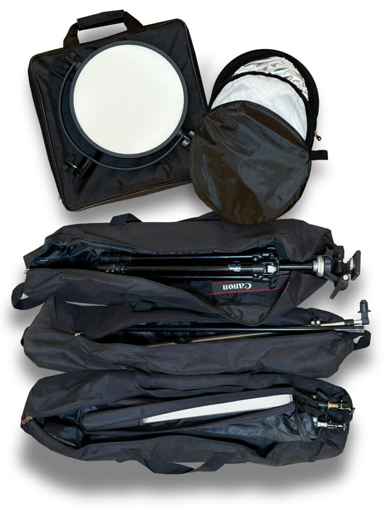 My kit (below, left to right) is built around (1) 32in Reflector, (1) 22” Beauty Dish, (1) LED Light Stick, (1) 36inx48in Diffuser and (1) 10.6in Round LED Light Panel.